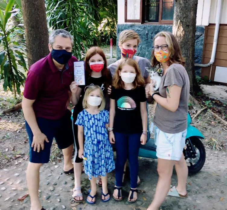 Long time member Agnieszka, who had just returned to Chiang Mai from Poland, and her husband Dan, heard a kitten crying during the night and couldn’t figure out where it was coming from. After searching around, they finally discovered that the meows were coming from their motorcycle. This appeared extremely worrying, as they had already driven it to the local shops that morning. Unfortunately neither Agnieszka or Dan could coax or pull the kitten out from hiding inside the bike. With nowhere else to turn they called a mechanic and a local vet, who managed to extricate a very scared, but miraculously, unhurt kitten from the motorcycle. It truly is incredible that this very lucky baby remained uninjured! Agnieszka and Dan named this little miracle, Scooter. How fitting!