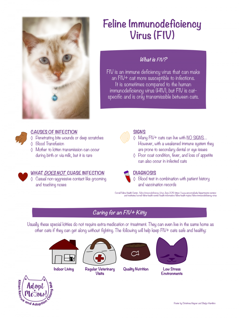 FIV (Feline immunodeficiency virus) is a viral infection that affects cats that causes a weaker immune system in comparison to non-FIV positive cats.