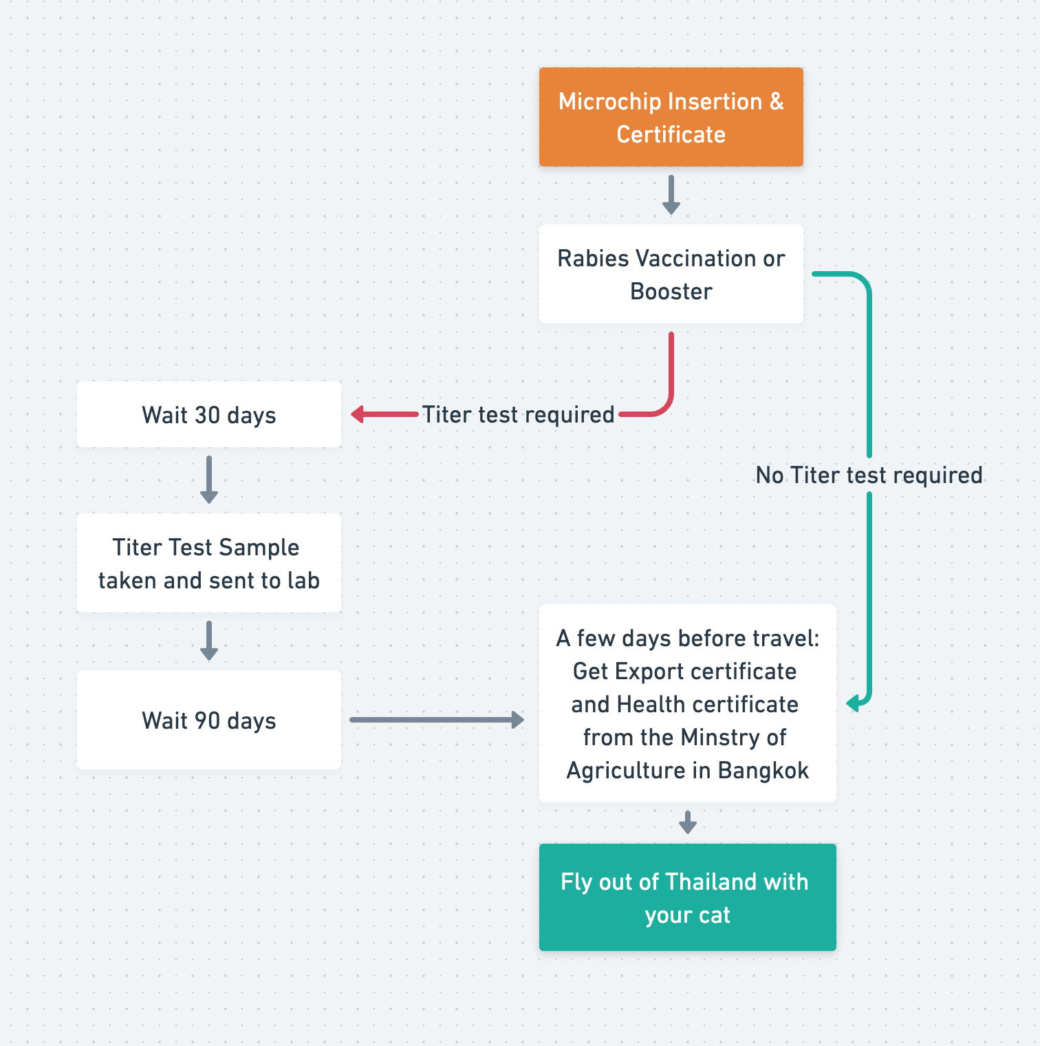 | Thailand approved export country | Microchip | Rabies Vaccine | Titer test | Health certificate | Quarantine | |