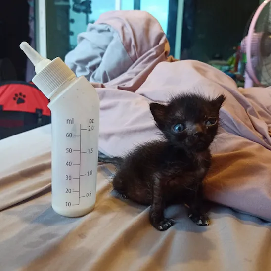 At the end of August, a Thai lady who lives about 45 minutes east of Mae Rim found 2 black neonate kittens on the side of the street. They were around 3 days old, the mum nowhere to be seen, with the umbilical cords still attached to both of them. Adopt Meow asked me to be an immediate foster and I agreed as my boyfriend and I were already caring for other neonates and had Adopt Meow’s incubator set up in our home. We raised these two siblings for two weeks, bottle feeding them every 2-3 hours, until one morning my boyfriend woke up to feed them at 5am and they both seemed absolutely fine, but then when I woke up at 7am to feed them again, one had sadly passed away. I was so utterly shocked at how fast this happened – they both seemed so fine.