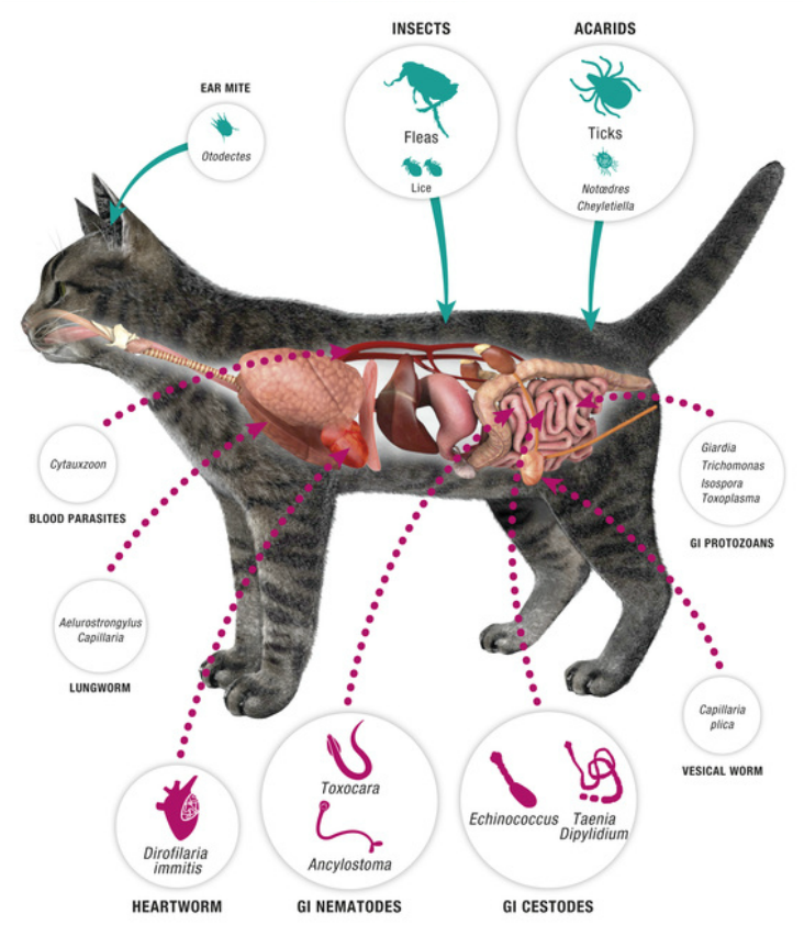 Parasites are indeed common in cats, especially those that go outdoors, and they can be treated quite easily. But they can also bring other health concerns and carry diseases, so it’s always best to take preventative measures. Parasites can be external and internal, here’s a quick guide: